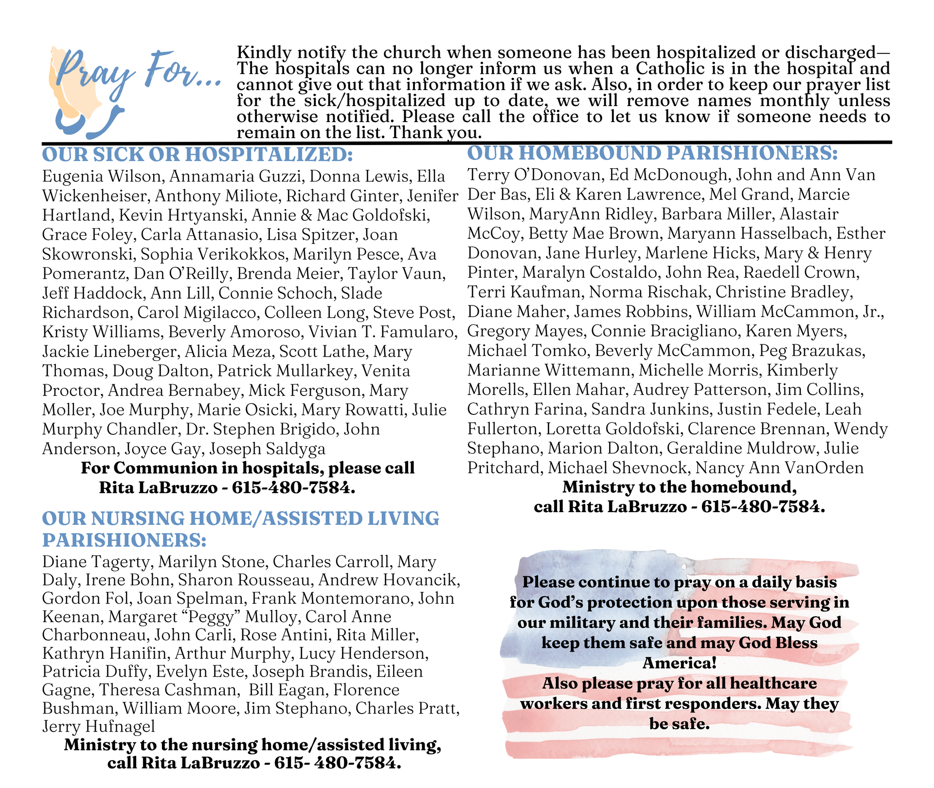 Kindly COMPLETE THE ABOVE FORM TO REQUEST SOMEONE BE PLACED ON A PRAYER LIST. Also, in order to keep our prayer list for the sick/hospitalized up to date, we will remove names monthly unless otherwise notified. Please call the office to let us know if someone needs to remain on the list. Thank you.