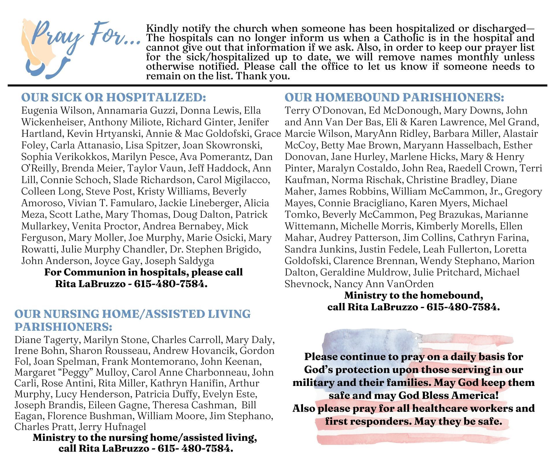 Kindly COMPLETE THE ABOVE FORM TO REQUEST SOMEONE BE PLACED ON A PRAYER LIST. Also, in order to keep our prayer list for the sick/hospitalized up to date, we will remove names monthly unless otherwise notified. Please call the office to let us know if someone needs to remain on the list. Thank you.